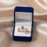 Elegant marquise-shaped design featuring emerald centerpiece with diamond halo in rose gold. Vintage-inspired glamour with color.